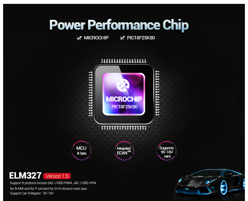 1. PICI8F25K80 Chip, real ELM327 1.5 version support 9 protocol include SAE-J1850 PWM , JAE J1850 VPW(for F-ord old cars and for G M old cars use this protocol like Explorer 1998 )